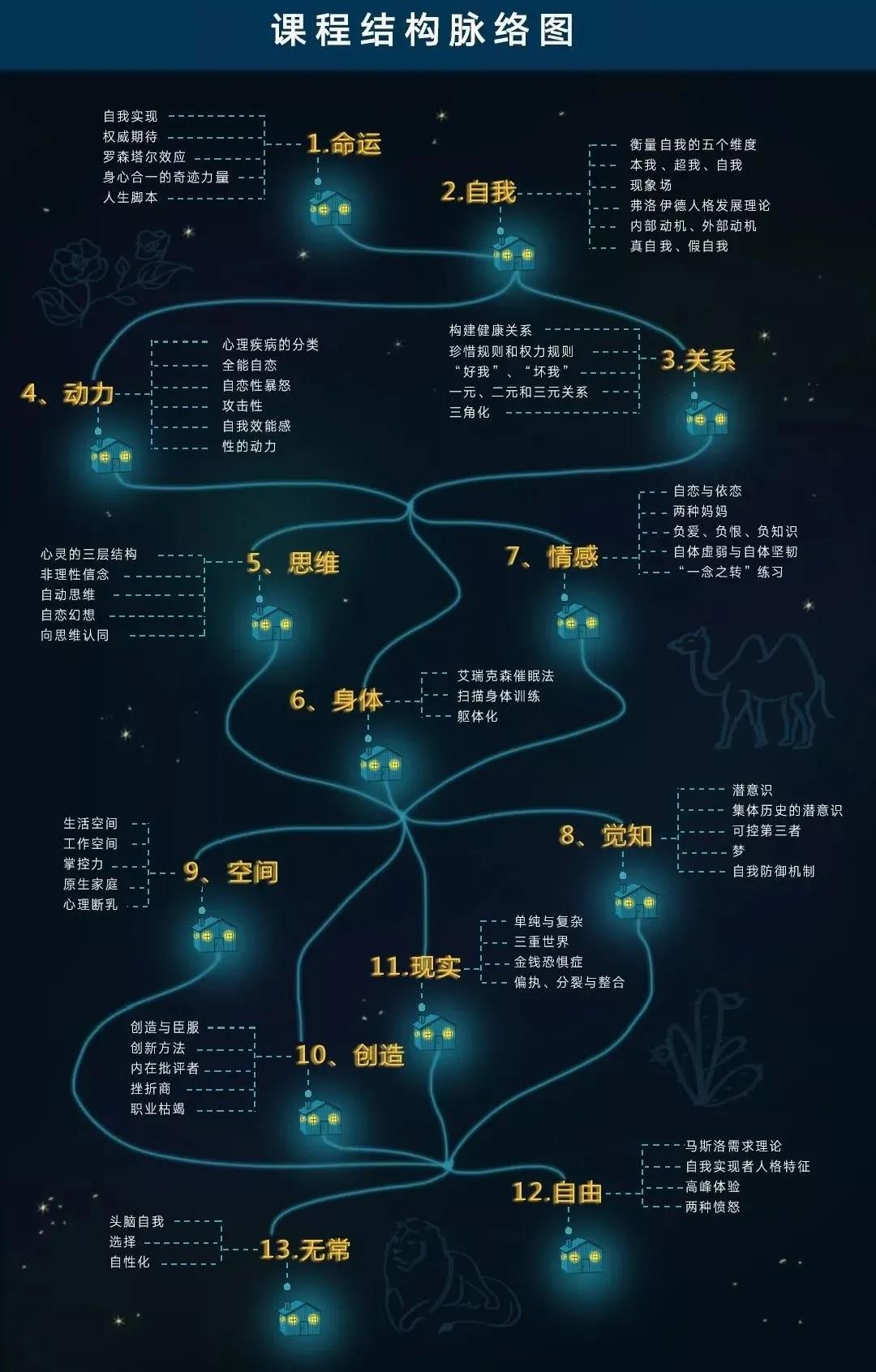 我们的心理学课程一共有十三个大主题,依次是命运、自我、关系、动力、思维、身体、情感、觉知、空间、创造、现实、自由和无常。